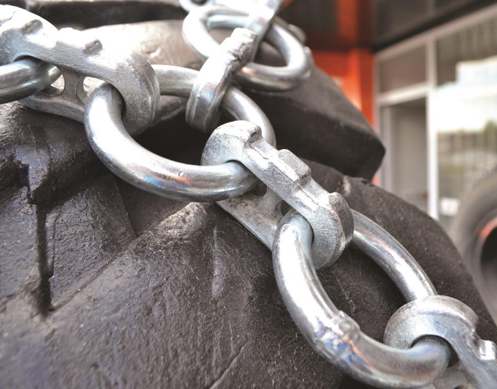 • The strengthened model with forged steel links, are especially manufactured for extereme use on heavy snow. • High quality heat treatment – Carburising. • Equipped with a tensioning chain and tensioning hook. • Use on both sides for longer life. • The running and surfaces are connected by welded rings. • Inner side chain with adjustable shackles for anoptimal fit on the tyre