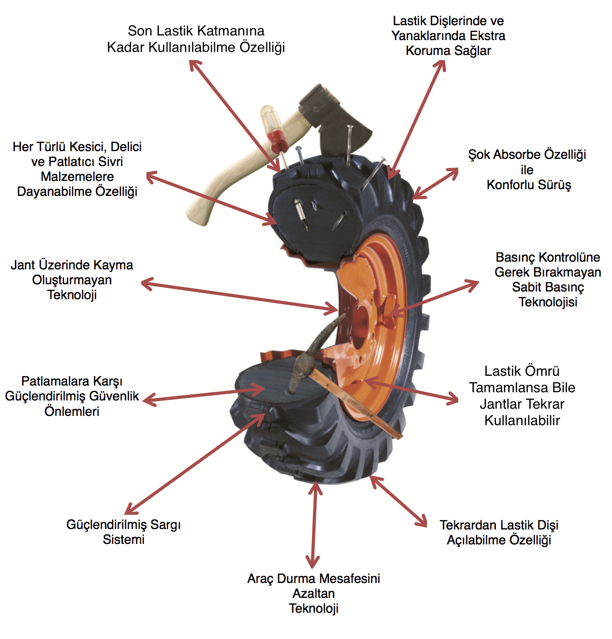 Lastiğin içinde bulunan hava yerinde özel polimer malzememiz sayesinde lastikleriniz asla patlamaz, yarılmaz ve hava kaybetmez. Esnekliği havalı lastiğe çok yakındır. Lastiğin ömrü boyunca işinize devam etmenizi garanti eder. Lastiğin en son katmanına kadar kullanılmasını sağlar. Lastiklerin tümü eşit basınçta olduğundan yakıt sarfiyatınız azaltır, erken aşınmayı ve ısınmayı önler. Yüksek dayanıklılık, denge ve sürüş hâkimiyeti sağlar. Ağırlığı ve dengesi sayesinde lastiğin yere tutunma, itme ve kayma direnci artar. Lastik hava basıncı kontrolüne gerek kalmaz, lastik sürekli ayni basınçta kalır. Hız 60 km/saat'i aşmayan her tür ve ebattaki lastiklere uygulanır. Lastiğin ömrünü uzatarak bakım ve işletme giderlerinden tasarruf sağlar.