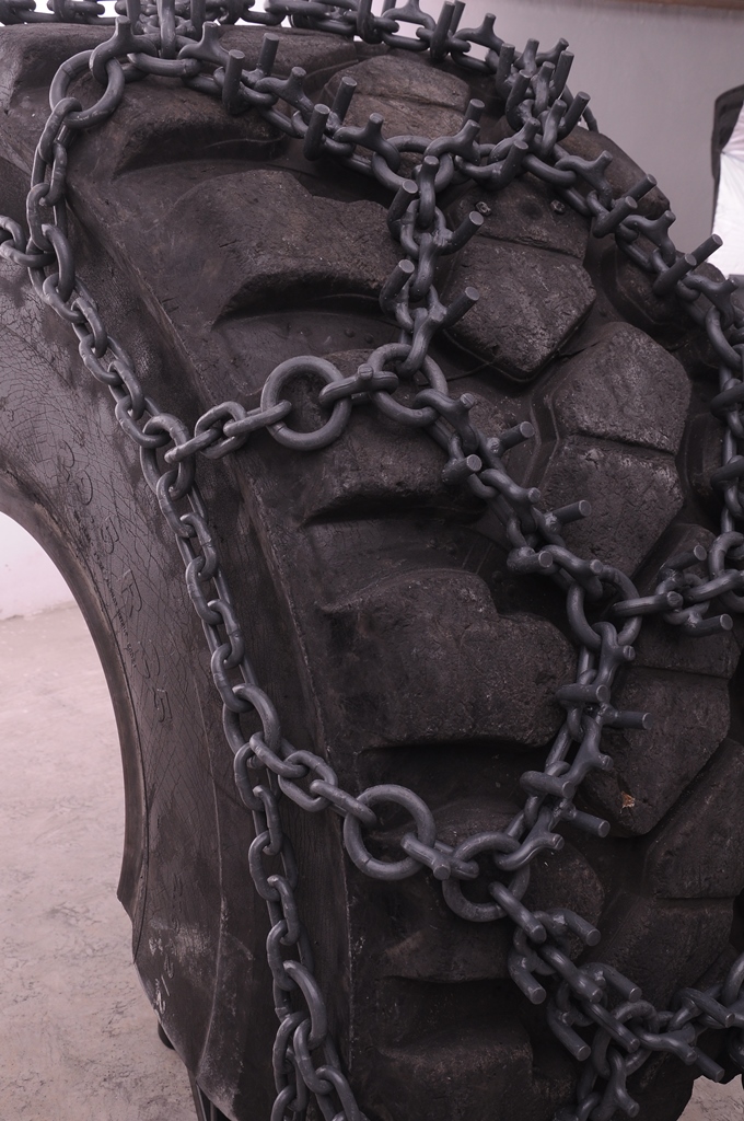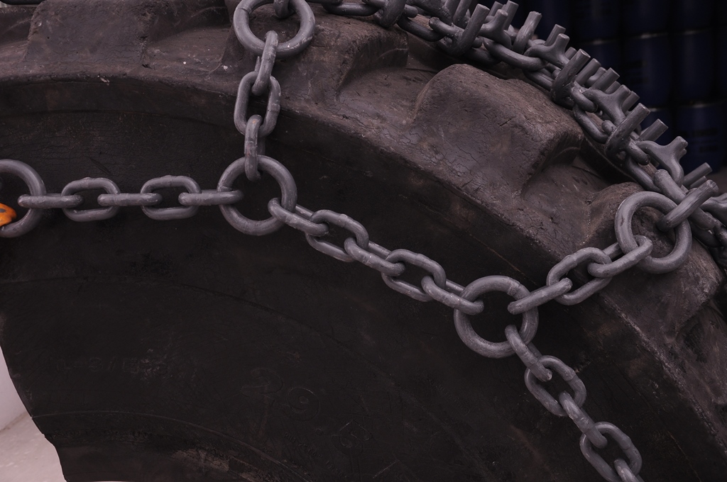 PENÇE model increases the traction with welded U-studs and drop forged spiked studs. Especially for softer terrains long welded U-studs provides excellent grip and drop forged spiked studs both increase the traction and operating life of PENÇE. In order to ensure long lasting of chain, flash welded rings are used which also provides easy mounting at worn tires with the help of adjustment elements. Side Chains: 13 – 16mm Wear & Connection Rings: 16 mm Welded U-Studs: 16 mm Drop - Forged Spiked Studs (Traction Links): 14 mm • Standard design is without tensioning chains but also available with tensioning system.