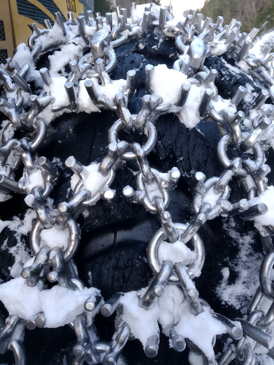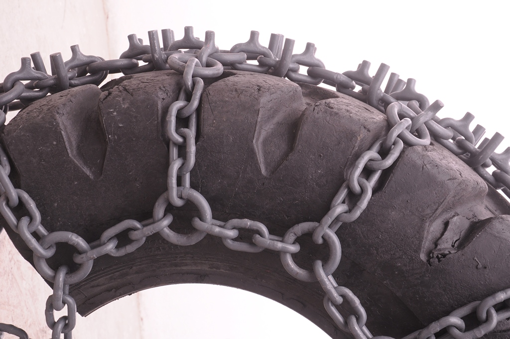 PENÇE model increases the traction with welded U-studs and drop forged spiked studs. Especially for softer terrains long welded U-studs provides excellent grip and drop forged spiked studs both increase the traction and operating life of PENÇE. In order to ensure long lasting of chain, flash welded rings are used which also provides easy mounting at worn tires with the help of adjustment elements. Side Chains: 13 – 16mm Wear & Connection Rings: 16 mm Welded U-Studs: 16 mm Drop - Forged Spiked Studs (Traction Links): 14 mm • Standard design is without tensioning chains but also available with tensioning system.